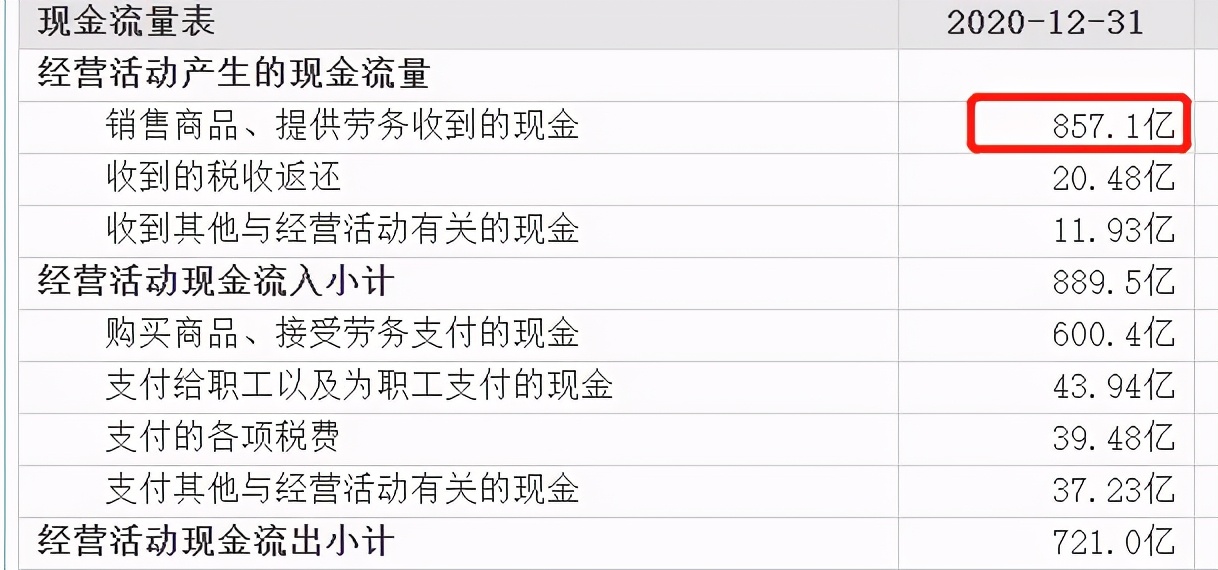 如前面提到的万华化学就是这样的,你别看他,一年花大几百亿去造工厂,但是人家压根就不需要去借钱啊,人家一年光经营活动收到的现金就达到了857亿。